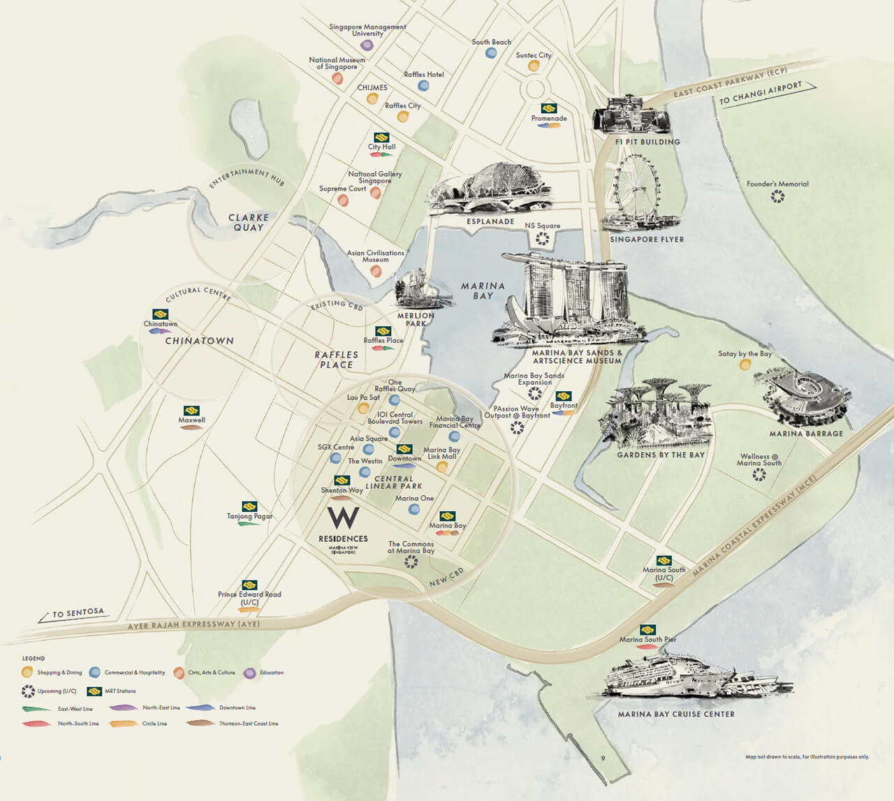 Perfectly positioned for both business and leisure, W Residences Marina View sits right beside Shenton Way MRT Station (Thomson–East Coast Line) and within a short stroll to Marina Bay MRT Station (North–South & Circle Lines).